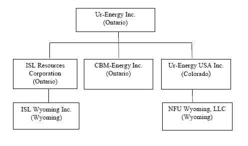 The Company has three wholly-owned subsidiaries: Ur-Energy USA Inc. (Ur-Energy USA), a company incorporated under the laws of the State of Colorado for the acquisition of properties in the United States; ISL Resources Corporation (ISL), a company incorporated under the laws of the Province of Ontario; and CBM-Energy Inc. (CBM), a company incorporated under the laws of the Province of Ontario, that is a shell company with no assets or liabilities other than those related to its incorporation. Ur-Energy USA has one wholly-owned subsidiary, NFU Wyoming, LLC (NFU), a company formed under the laws of the State of Wyoming to facilitate the Companys acquisition of certain assets from New Frontiers Uranium, LLC. ISL has one wholly-owned subsidiary, ISL Wyoming Inc., a company incorporated under the laws of the State of Wyoming.