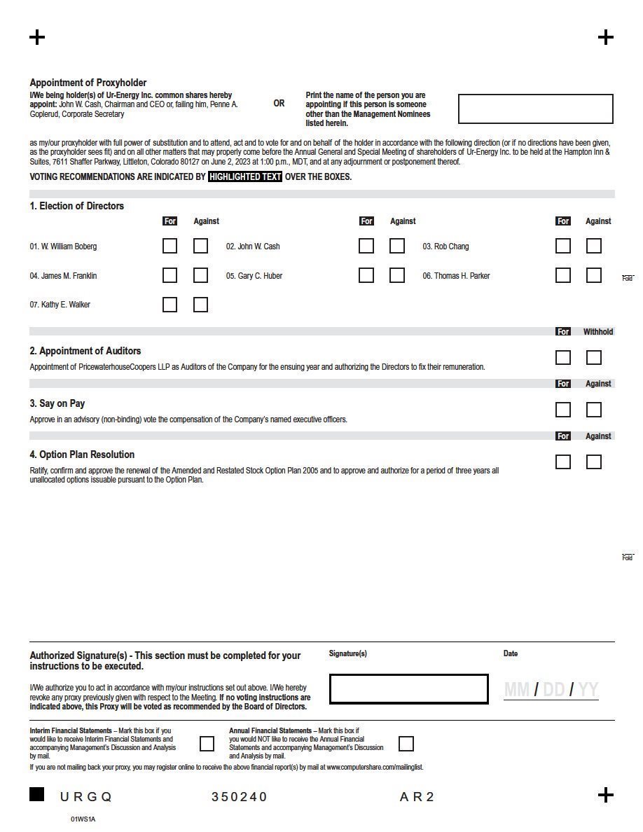 Important Notice Regarding Availability of Proxy Materials for the 2023 Annual and Special Meeting of Shareholders: The attached Management Proxy Circular, proxy card or voter information form, and the Company’s Annual Report to Shareholders (including financial statements) for the fiscal year ended December 31, 2022 are available at www.envisionreports.com/URGQ2023 or can be found at https://www.ur-energy.com.