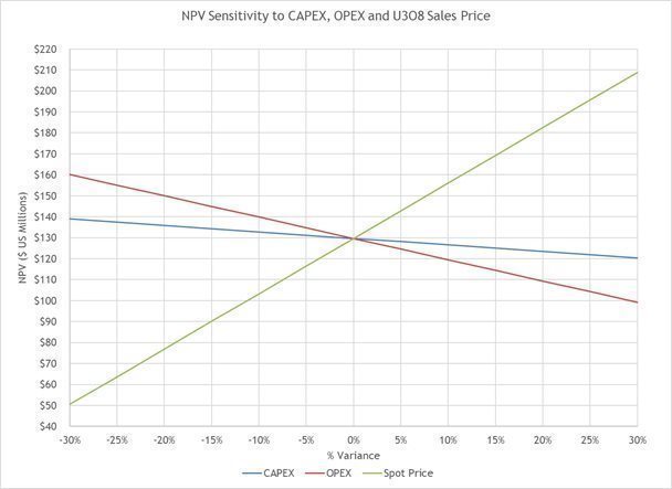 The Project is most sensitive to changes in the price of uranium as shown in Figure 22. A five percent change in the estimated commodity price results in a $13.2 million change to the NPV at a discount rate of eight percent. This analysis is based on a variable commodity price per pound. The Project is also somewhat sensitive to changes in OPEX costs. A five percent variation in OPEX results in a $5.1 million variation in NPV. The Project is least sensitive to changes in CAPEX. A five percent variation in CAPEX results in a $1.6 million variation in NPV.