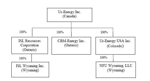 The Companys direct and indirect subsidiaries are Ur-Energy USA Inc. (Ur-Energy USA), NFU Wyoming, LLC, ISL Resources Corporation, CBM-Energy Inc. and ISL Wyoming Inc. Set out below are the jurisdictions in which they are incorporated or organized.