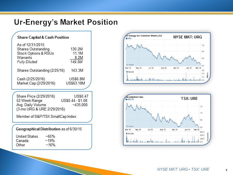 NYSE MKT: URG • TSX: URE 3 See Disclaimer re Forward - looking Statements and Projections (slide 2) ▪ Lost Creek ISR Uranium Facility Initiated Production 3Q 2013 • Produced 1,000,000 th pound of U 3 0 8 2Q 2015 • State of the art flagship project • Results demonstrate that Lost Creek is a reliable, low cost production center – “steady state” production ▪ Resource Growth – Two 2015 Updates • Lost Creek Property net increase of 4.6 million lbs. Measured & Indicated resource • Resources from exploration drilling: 139,000lbs Measured & Indicated ; 498,000lbs Inferred ▪ Realizing better sales prices through long term sales agreements ▪ Pathfinder - Shirley Basin, our Next Development • PEA Completed in January 2015 • Application for permit filed 4Q 2015; work on other applications is underway