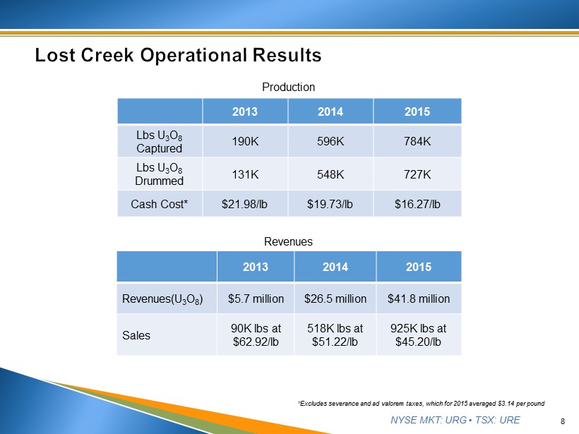 NYSE MKT: URG • TSX: URE 7 2015 Q1 2015 Q2 2015 Q3 2015 Q4 2015 Captured Lbs. 192k 207k 172k 212k 784k Drummed Lbs. 177k 184k 177k 189k 727k Shipped Lbs. 172k 180k 184k 182k 717k HHs Operating 9 10 11 12 12 Avg. Grade 110 ppm 108 ppm 86 ppm 85 ppm 97 ppm U 3 O 8 Production ▪ All plant systems functional with maintenance occurring as necessary. • RO is idle until flow rates are elevated or restoration is initiated. ▪ Waste Water • Class V UIC water disposal under regulatory review – will allow for overall reduction in waste water to Class I UIC wells once incorporated. • Class I UIC disposal wells are available and utilized as necessary. • Storage ponds utilized as necessary for waste water storage. Lost Creek Plant
