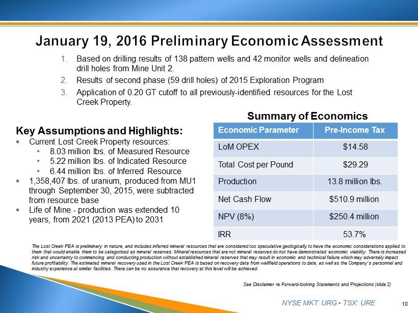 NYSE MKT: URG • TSX: URE ▪ In 2015, Ur - Energy substantially increased Lost Creek Property resources by adding 4.6 million lbs. of Measured & I ndicated (M&I) Resources and 1.7 million lbs. of Inferred Resources • June 17, 2015 43 - 101 Technical Report disclosed an additional 1.5 million lbs. of net M&I Resources and 0.3 million lbs. of Inferred Resources Subtracted out MU1 production Lowered GT cut - off from 0.30 to 0.20 • January 19, 2016 Preliminary Economic Assessment added another 3.1 million lbs. of M&I Resources and 1.4 million lbs. of Inferred Resources • Results of 2015 Exploration Program included in above reports 9 See Disclaimer re Forward - looking Statements and Projections (slide 2) Lost Creek Property * Preliminary Economic Assessment for the Lost Creek Property, Sweetwater County, Wyoming prepared by TREC Inc. – January 19, 2016 (posted on SEDAR).