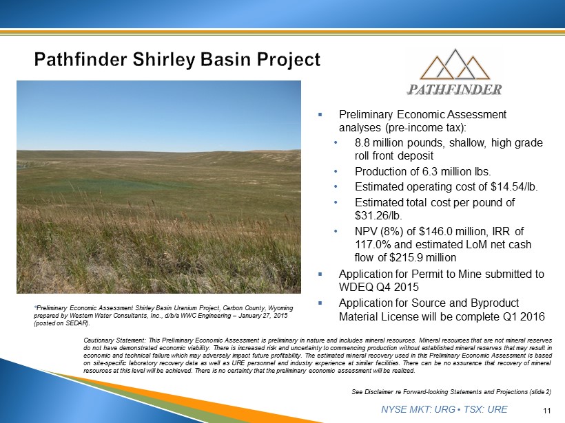 NYSE MKT: URG • TSX: URE Economic Parameter Pre - Income Tax LoM OPEX $14.58 Total Cost per Pound $29.29 Production 13.8 million lbs. Net Cash Flow $510.9 million NPV (8%) $250.4 million IRR 53.7% 1. Based on drilling results of 138 pattern wells and 42 monitor wells and delineation drill holes from Mine Unit 2. 2. Results of second phase (59 drill holes) of 2015 Exploration Program 3. Application of 0.20 GT cutoff to all previously - identified resources for the Lost Creek Property. 10 Summary of Economics Key Assumptions and Highlights: ▪ Current Lost Creek Property resources: • 8.03 million lbs. of Measured Resource • 5.22 million lbs. of Indicated Resource • 6.44 million lbs. of Inferred Resource ▪ 1,358,407 lbs. of uranium, produced from MU1 through September 30, 2015, were subtracted from resource base ▪ Life of Mine - production was extended 10 years, from 2021 (2013 PEA) to 2031 The Lost Creek PEA is preliminary in nature, and includes inferred mineral resources that are considered too speculative geol ogi cally to have the economic considerations applied to them that would enable them to be categorized as mineral reserves. Mineral resources that are not mineral reserves do not hav e d emonstrated economic viability. There is increased risk and uncertainty to commencing and conducting production without established mineral reserves that may result in economic an d technical failure which may adversely impact future profitability. The estimated mineral recovery used in the Lost Creek PEA is based on recovery data from wellfield oper ati ons to date, as well as the Company’s personnel and industry experience at similar facilities. There can be no assurance that recovery at this level will be achieved. See Disclaimer re Forward - looking Statements and Projections (slide 2)