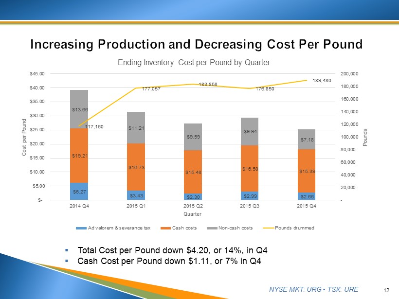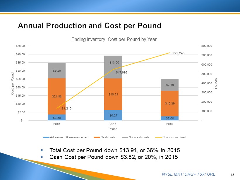 NYSE MKT: URG • TSX: URE 12 ▪ Total Cost per Pound down $4.20, or 14%, in Q4 ▪ Cash Cost per Pound down $1.11, or 7% in Q4 $6.27 $3.43 $2.30 $2.99 $2.66 $19.21 $16.73 $15.48 $16.50 $15.39 $13.66 $11.21 $9.59 $9.94 $7.18 117,160 177,057 183,858 176,850 189,480 - 20,000 40,000 60,000 80,000 100,000 120,000 140,000 160,000 180,000 200,000 $- $5.00 $10.00 $15.00 $20.00 $25.00 $30.00 $35.00 $40.00 $45.00 2014 Q4 2015 Q1 2015 Q2 2015 Q3 2015 Q4 Pounds Cost per Pound Quarter Ending Inventory Cost per Pound by Quarter Ad valorem & severance tax Cash costs Non-cash costs Pounds drummed