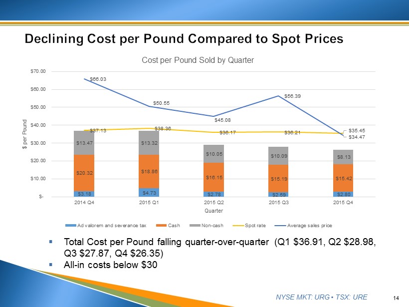 NYSE MKT: URG • TSX: URE 13 ▪ Total Cost per Pound down $13.91, or 36%, in 2015 ▪ Cash Cost per Pound down $3.82, or 20%, in 2015 $3.59 $6.27 $2.66 $21.98 $19.21 $15.39 $9.29 $13.66 $7.18 131,216 547,992 727,245 - 100,000 200,000 300,000 400,000 500,000 600,000 700,000 800,000 $- $5.00 $10.00 $15.00 $20.00 $25.00 $30.00 $35.00 $40.00 $45.00 2013 2014 2015 Pounds Cost per Pound Year Ending Inventory Cost per Pound by Year Ad valorem & severance tax Cash costs Non-cash costs Pounds drummed