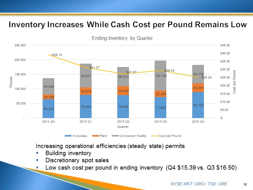 NYSE MKT: URG • TSX: URE 15 ▪ Total Cost per Pound down $4.96, or 14%, in 2015 ▪ Cash Cost per Pound down, $3.46, or 18%, in 2015 $7.58 $2.48 $3.14 $21.98 $19.73 $16.27 $12.41 $12.28 $10.12 $38.17 $33.21 $36.55 $62.92 $51.22 $45.20 $- $10.00 $20.00 $30.00 $40.00 $50.00 $60.00 $70.00 2013 2014 2015 $ per Pound Year Cost per Pound Sold by Year Ad valorem and severance tax Cash Non-cash Spot rate Average sales price