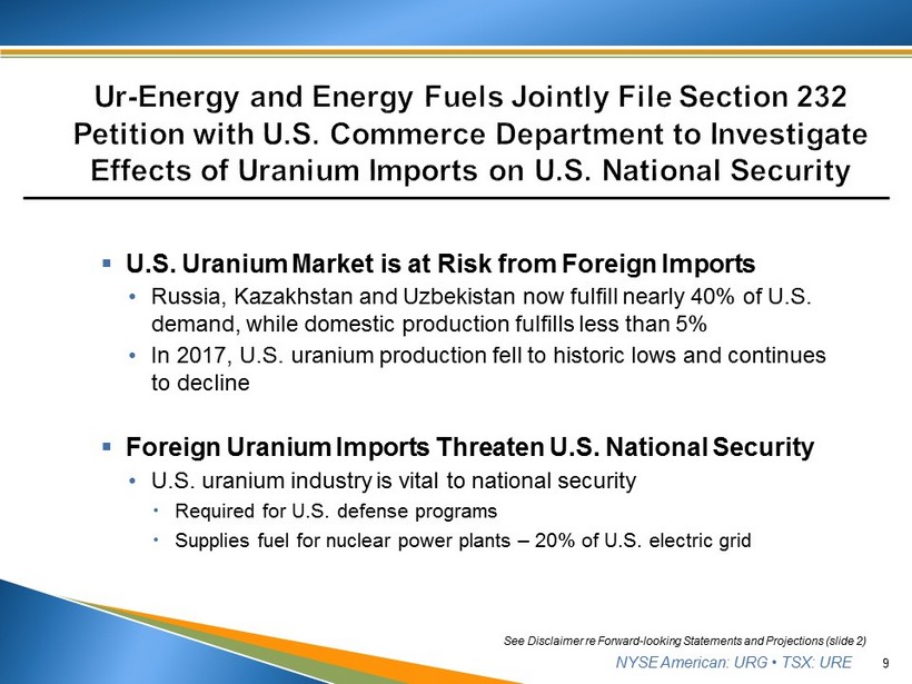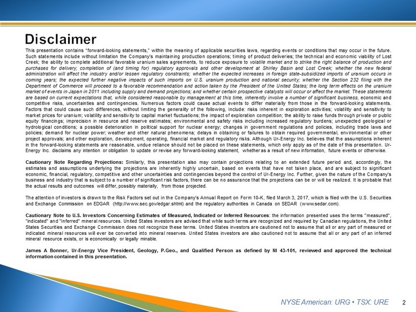 NYSE American: URG • TSX: URE This presentation contains “forward - looking statements,” within the meaning of applicable securities laws, regarding events or conditions that may occur in the future . Such statements include without limitation the Company’s maintaining production operations ; timing of product deliveries ; the technical and economic viability of Lost Creek ; the ability to complete additional favorable uranium sales agreements, to reduce exposure to volatile market and to strike the right balance of production and purchases for delivery ; completion of (and timing for) regulatory approvals and other development at Shirley Basin and Lost Creek ; whether the new federal administration will affect the industry and/or lessen regulatory constraints ; whether the expected increases in foreign state - subsidized imports of uranium occurs in coming years ; the expected further negative impacts of such imports on U . S . uranium production and national security ; whether the Section 232 filing with the Department of Commerce will proceed to a favorable recommendation and action taken by the President of the United States ; the long term effects on the uranium market of events in Japan in 2011 including supply and demand projections ; and whether certain prospective catalysts will occur or affect the market . These statements are based on current expectations that, while considered reasonable by management at this time, inherently involve a number of significant business , economic and competitive risks, uncertainties and contingencies . Numerous factors could cause actual events to differ materially from those in the forward - looking statements . Factors that could cause such differences, without limiting the generality of the following, include : risks inherent in exploration activities ; volatility and sensitivity to market prices for uranium ; volatility and sensitivity to capital market fluctuations ; the impact of exploration competition ; the ability to raise funds through private or public equity financings ; imprecision in resource and reserve estimates ; environmental and safety risks including increased regulatory burdens ; unexpected geological or hydrological conditions ; a possible deterioration in political support for nuclear energy ; changes in government regulations and policies, including trade laws and policies ; demand for nuclear power ; weather and other natural phenomena ; delays in obtaining or failures to obtain required governmental, environmental or other project approvals ; and other exploration, development, operating, financial market and regulatory risks . Although Ur - Energy Inc . believes that the assumptions inherent in the forward - looking statements are reasonable, undue reliance should not be placed on these statements, which only apply as of the date of this presentation . Ur - Energy Inc . disclaims any intention or obligation to update or revise any forward - looking statement, whether as a result of new information, future events or otherwise . Cautionary Note Regarding Projections : Similarly, t his presentation also may contain projections relating to an extended future period and, accordingly, the estimates and assumptions underlying the projections are inherently highly uncertain, based on events that have not taken place, and are subject to significant economic, financial, regulatory, competitive and other uncertainties and contingencies beyond the control of Ur - Energy Inc . Further, given the nature of the Company's business and industry that is subject to a number of significant risk factors, there can be no assurance that the projections can be or will be realized . It is probable that the actual results and outcomes will differ, possibly materially, from those projected . The attention of investors is drawn to the Risk Factors set out in the Company's Annual Report on Form 10 - K, filed March 3 , 2017 , which is filed with the U . S . Securities and Exchange Commission on EDGAR (http : //www . sec . gov/edgar . shtml) and the regulatory authorities in Canada on SEDAR (www . sedar . com) . Cautionary Note to U . S . Investors Concerning Estimates of Measured, Indicated or Inferred Resources : the information presented uses the terms "measured", "indicated" and "inferred" mineral resources . United States investors are advised that while such terms are recognized and required by Canadian regulations, the United States Securities and Exchange Commission does not recognize these terms . United States investors are cautioned not to assume that all or any part of measured or indicated mineral resources will ever be converted into mineral reserves . United States investors are also cautioned not to assume that all or any part of an inferred mineral resource exists, or is economically or legally minable . James A Bonner, Ur - Energy Vice President, Geology, P . Geo . , and Qualified Person as defined by NI 43 - 101 , reviewed and approved the technical information contained in this presentation . 2