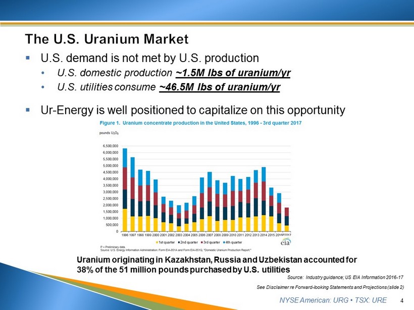 NYSE American: URG • TSX: URE 3 See Disclaimer re Forward - looking Statements and Projections (slide 2) ▪ Lost Creek ISR Uranium Facility • Four years of consistent production from MU1; Initiated MU2 production in 2017 Q3 • Produced ~2.4M lbs. U 3 0 8 through 2017 Q4 including initial production from MU2 ▪ Forging a path forward for growth of the domestic uranium industry • Joint Section 232 filing requests investigation into effects of uranium imports on national security • Determination could dramatically affect the future of U.S. uranium production ▪ Flexibility and value realized through higher - priced term sales agreements (scheduling, assignments, purchases) • Balancing purchased and produced pounds for delivery • 2017 Sales of $38.3M on 780,000 lbs. at avg. $49.09/lb. • 37% gross profit margin through 2017 Q3 ▪ Growing our future - continued Lost Creek development, LC East permit amendment and Shirley Basin permitting
