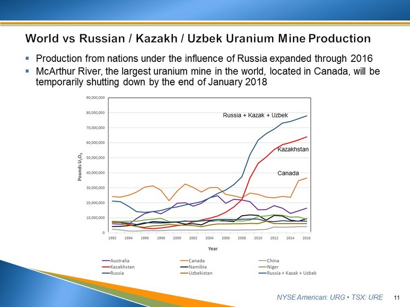 NYSE American: URG • TSX: URE ▪ Uranium used for defense, including for tritium production, nuclear weapons, and naval propulsion, must be sourced from U.S. mines pursuant to international law. ▪ U.S. nuclear utilities are growing increasingly dependent upon nations who do not share our values. ▪ Many of the nations we rely on for commercial fuel are unstable themselves or are located within unstable regions (ISIS presence). ▪ The unallocated DOE excess inventory is now less than one year’s supply for our nuclear utilities. 10