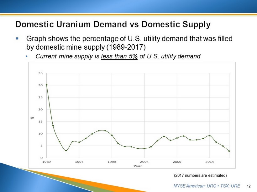 NYSE American: URG • TSX: URE ▪ Graph shows the percentage of U.S. utility demand that was filled by domestic mine supply (1989 - 2017) • Current mine supply is less than 5% of U.S. utility demand 12 (2017 numbers are estimated)