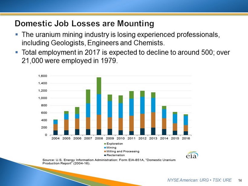 NYSE American: URG • TSX: URE ▪ The uranium mining industry is losing experienced professionals, including Geologists, Engineers and Chemists. ▪ Total employment in 2017 is expected to decline to around 500; over 21,000 were employed in 1979. 14
