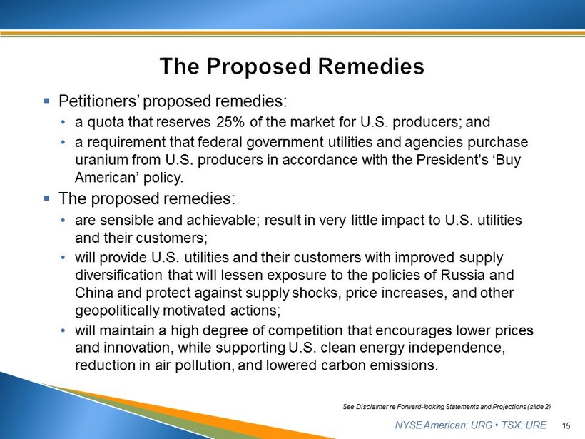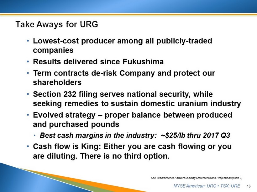 NYSE American: URG • TSX: URE ▪ Petitioners’ proposed remedies: • a quota that reserves 25% of the market for U.S. producers; and • a requirement that federal government utilities and agencies purchase uranium from U.S. producers in accordance with the President’s ‘Buy American’ policy. ▪ The proposed remedies: • are sensible and achievable; result in very little impact to U.S. utilities and their customers; • will provide U.S. utilities and their customers with improved supply diversification that will lessen exposure to the policies of Russia and China and protect against supply shocks, price increases, and other geopolitically motivated actions; • will maintain a high degree of competition that encourages lower prices and innovation, while supporting U.S. clean energy independence, reduction in air pollution, and lowered carbon emissions. 15 See Disclaimer re Forward - looking Statements and Projections (slide 2)