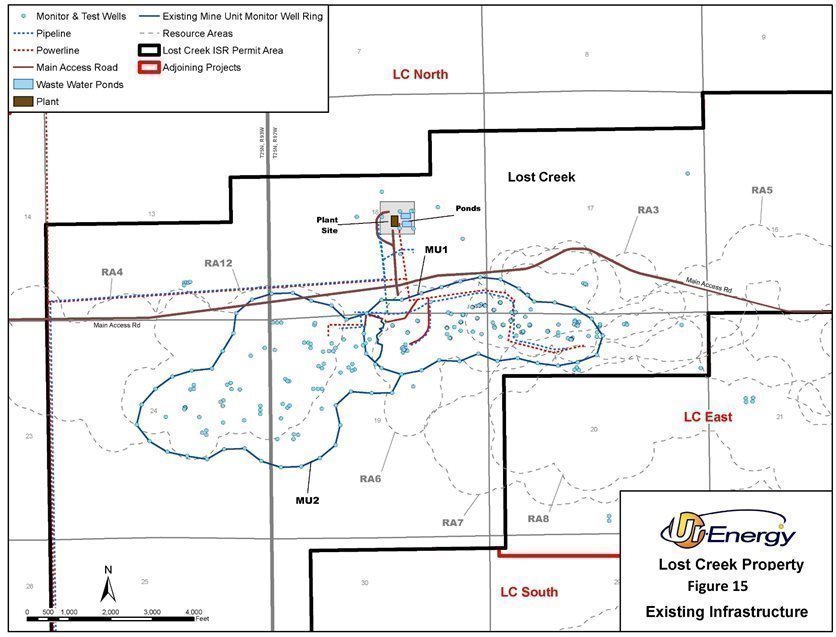 The Lost Creek Project is in production. However, as of December 31, 2021, operations consisted primarily of maintaining minimum bleed requirements in the wellfields due to depressed uranium prices. The plant and wellfields remain fully operational in order to take advantage of improving uranium prices. Construction of the Lost Creek plant and installation of MU1 was initiated in October 2012. Production operations in MU1 within the HJ Horizon began on August 2, 2013. From the beginning of operations through December 31, 2021, 2.735 million pounds U3O8 have been produced and captured. All the wells to support 13 HHs of MU1 and the first three HHs of MU2 have been completed.