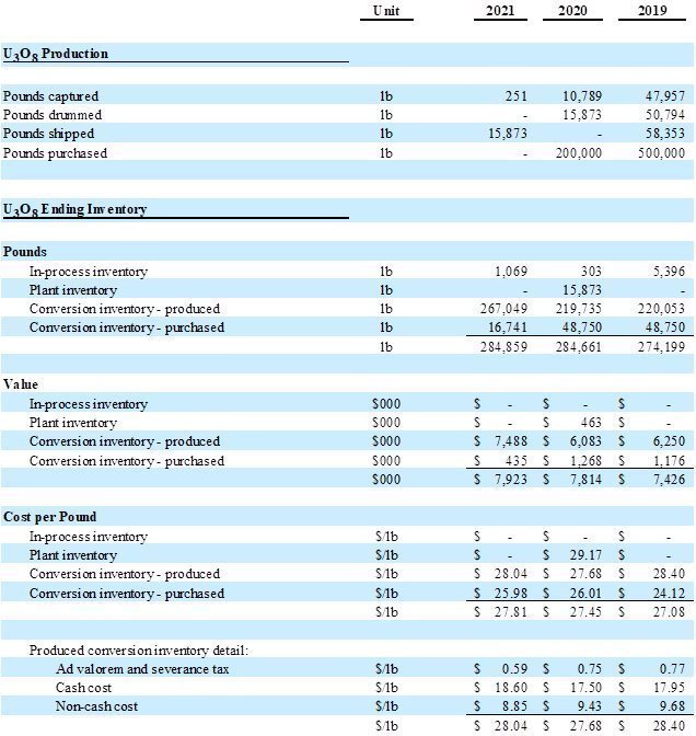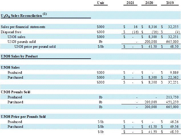 The following tables provide detailed financial information on our sales, cost of sales, and production and ending inventory as they relate to U3O8 pounds. The U3O8 and cost per pound measures included in the following tables do not have a standardized meaning within US GAAP or a defined basis of calculation. These measures are used by management to assess business performance and determine production and pricing strategies. They may also be used by certain investors to evaluate performance. Where applicable, reconciliation of these measures to US GAAP financial statement presentation are included within the respective table.