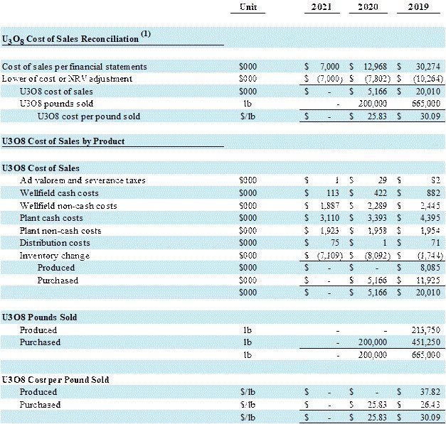 Cost of sales per the financial statements include lower of cost or net realizable value (“NRV”) adjustments. The NRV adjustments do not relate to U3O8 pounds sold and are excluded from the U3O8 cost of sales and U3O8 cost per pound sold figures.