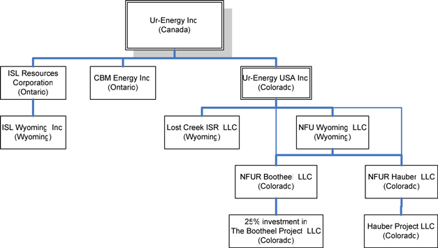 Ur-Energy USA has two wholly-owned subsidiaries: NFU Wyoming, LLC (“NFU Wyoming”), a limited liability company formed under the laws of the State of Wyoming to facilitate the Corporation’s acquisition of certain property and assets; and, Lost Creek ISR, LLC, a limited liability company formed under the laws of the State of Wyoming to hold and operate the Corporation’s Lost Creek Project property and assets.
